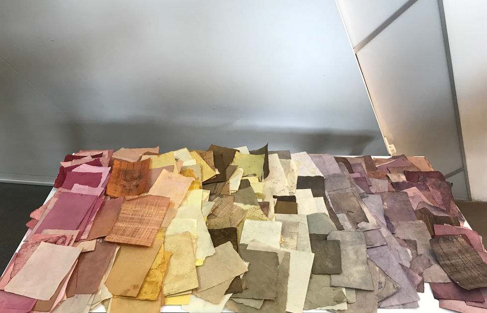 Mixed Media Participatory Installation: natural papers hand-dyed with plant-based dyes, bookbinding thread. (10/2017).